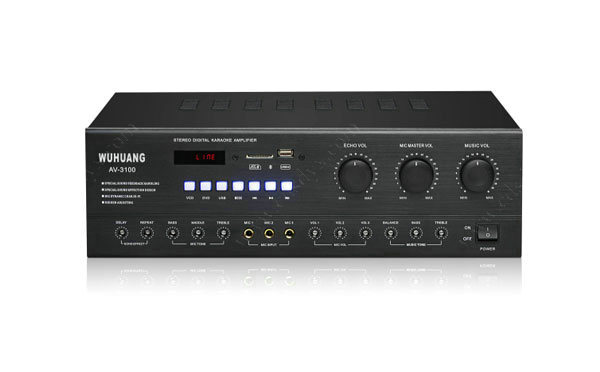 100W*2/8歐  頻率響應 20Hz-20kHz 總諧波失真 0.05%  尺寸:430*330*130mm  裝載USB/SD卡 藍牙播放器並配套紅外線遙控  三路麥克風輸入 內置卡拉OK自動靜噪電路 卡拉OK激勵效果功能  開機