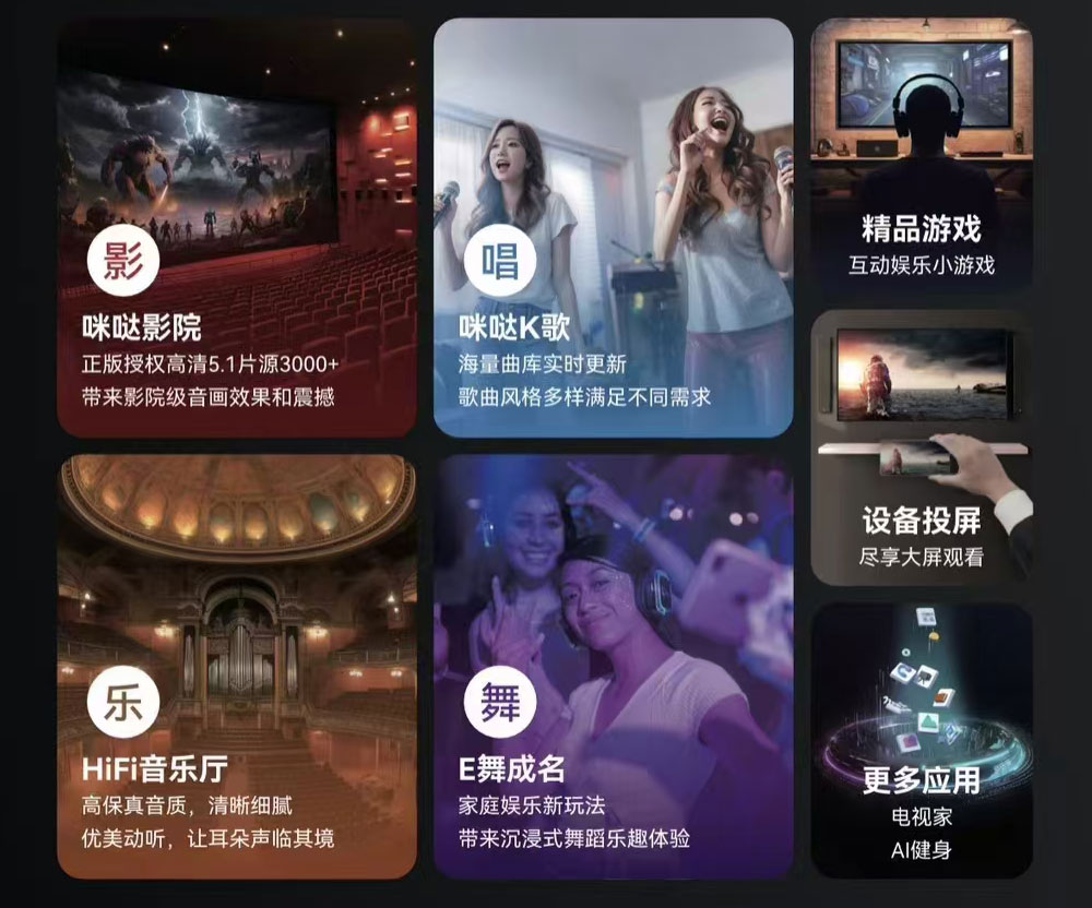 內置咪噠影音係統,集成咪噠午夜电影污网APP、咪噠K歌等多元化娛樂應用;