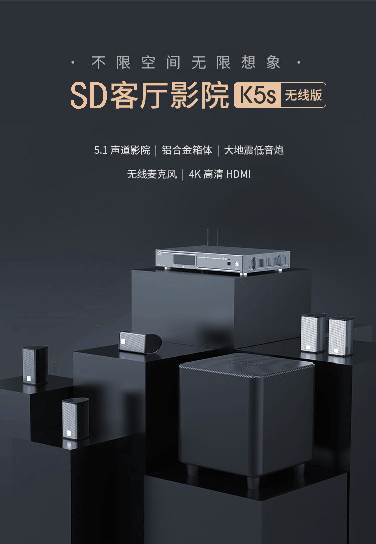 K5S設計有獨立的5.1解碼處理器可以輕鬆應對各種片源解碼;內置UHF無線話筒接收器,亦可外掛話筒;內置5.8G無線後環繞接收器。精致小巧的鋁合金外殼衛星箱