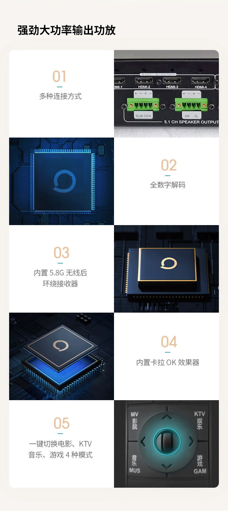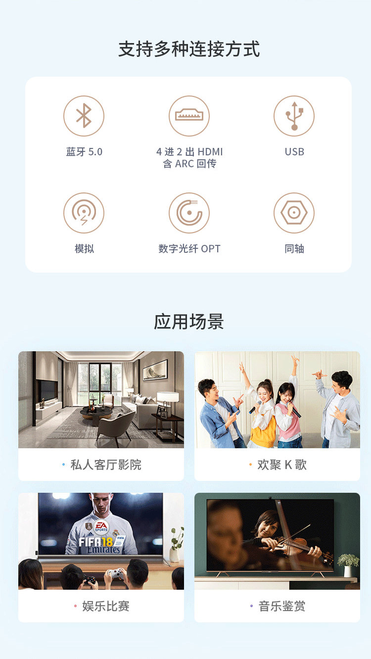 腔體采取渦輪式排列,對地增壓,釋放強大震撼感。功放主機具有視頻四路高清4K HDMI輸入和2路HDMI輸出,其中包含ARC回傳功能。數字COX、OPT輸入、模擬AUX、5.0藍牙播放功能。隨機自帶4種出場模式