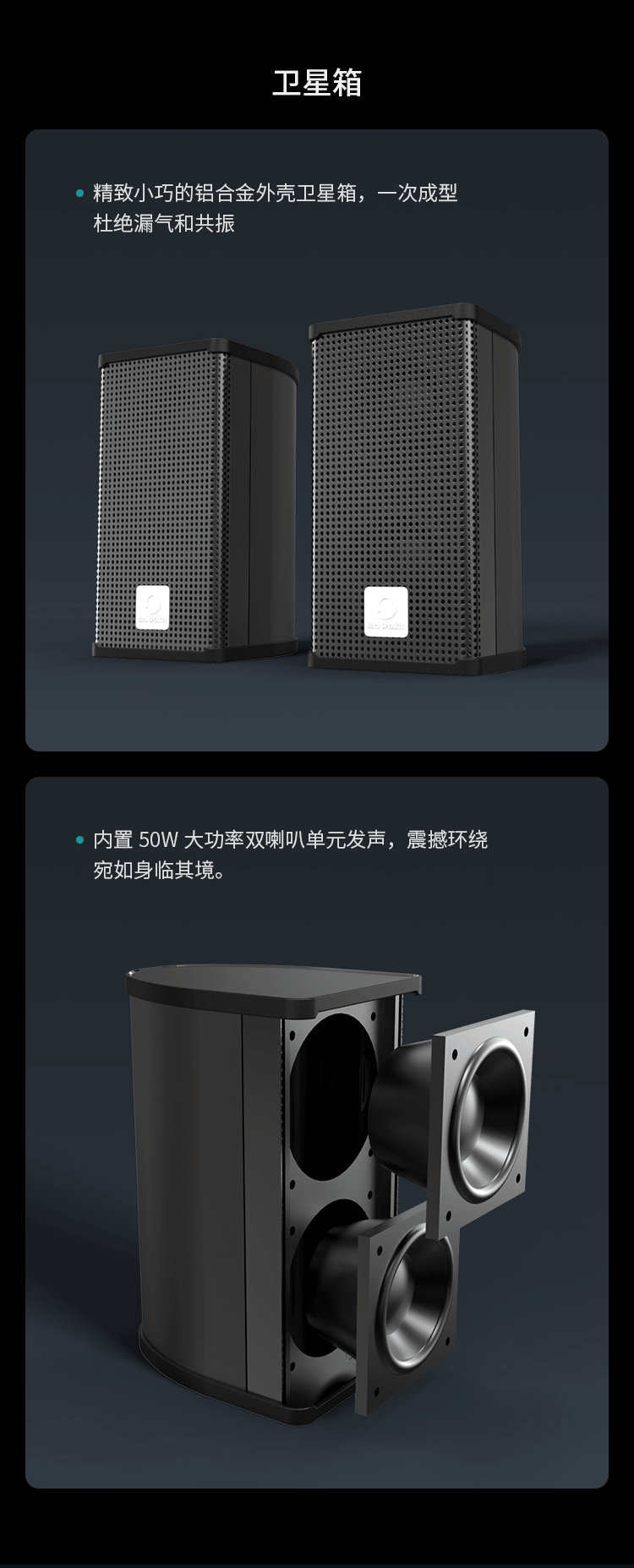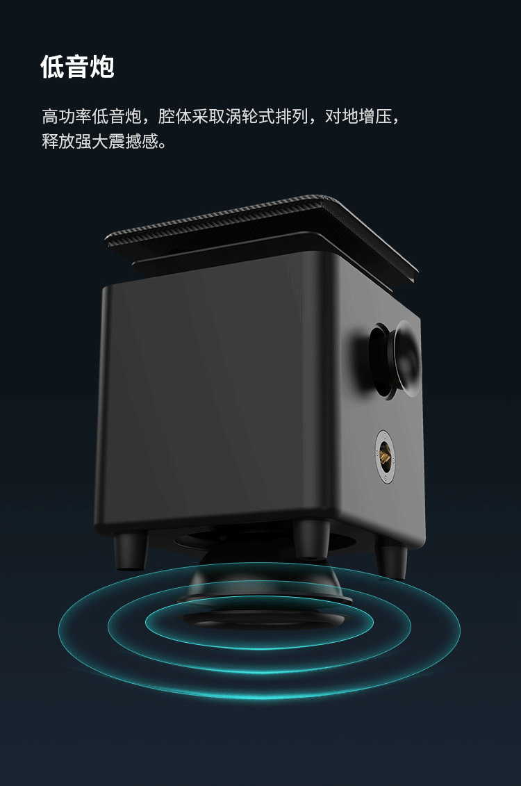 一次成型,杜絕漏氣和共振。內置雙喇叭單元發聲,細膩溫潤,真實飽滿。高功率低音炮
